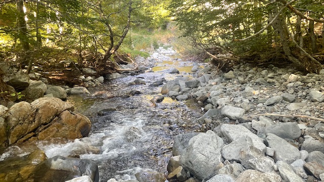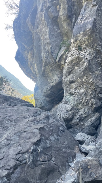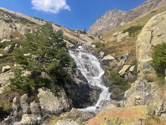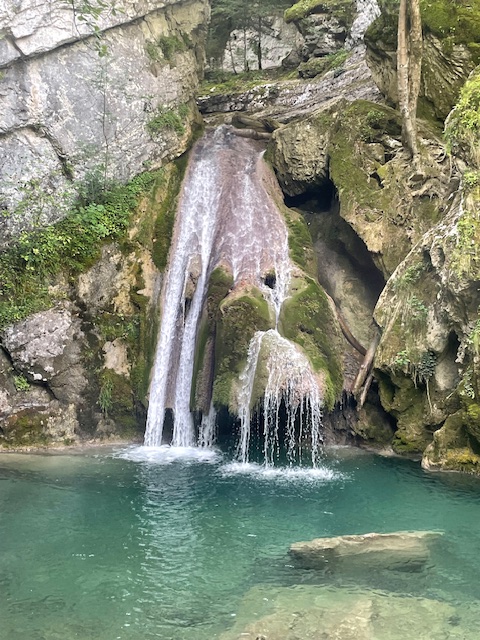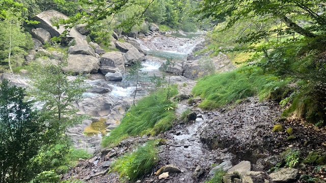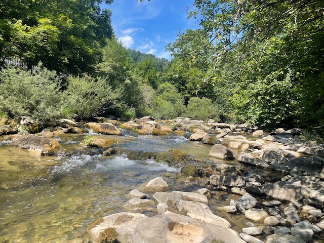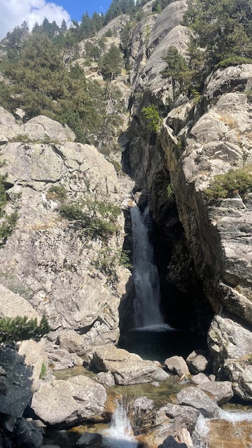 Der Bach, der uns bei unseren Abstieg in unbarmherziger Sonneneinstrahlung über einen engen steinigen Pfad mit sehr wenig schattigen Stellen begleitet, bildet unterhalb eines kleinen Wasserfall im unteren Drittel des Abstiegs ein Wirlpool-großes Wasserbasseng, das schnell von allen Vorbeiwandernden, auch unserer französischen Wandgrupoe mindestens zum Abkühlen der Füße genutzt wird. Viele packen auch die Badesachen aus.