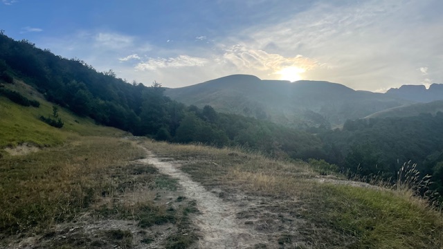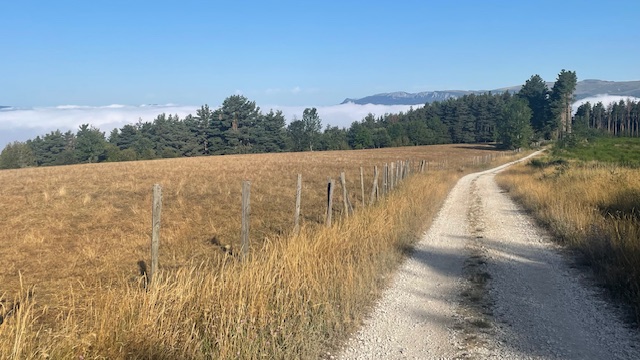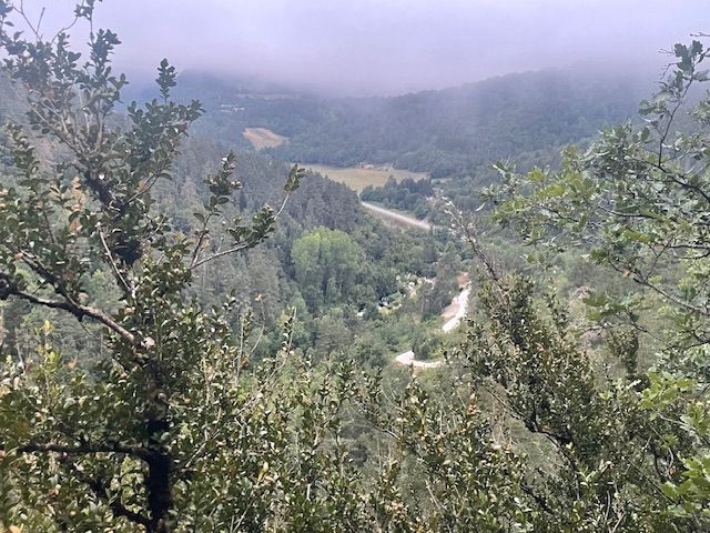 Der gut vor Ort ausgeschilderte GR 11 führt ab hier vorläufig über eine Forststraße, auf der sich auch gerne Mountainbike- und Motorradfahrer sowie geländetaugliche Cheeps mit gefühlt maximal möglicher Geschwindigkeit bewegen. Dies ist für uns unschön, aber jede Begegnung ist stets ungefährlich auf den meistens gut einsehbaren Streckenabschnitten. Den Gipfel des Zamaingurua (1.151 m), den wir auf dem Weg passieren nehmen wir als solchen überhaupt nicht war. Dafür ist der Wechsel der klimatischen Bedingungen nicht zu unübersehbar: Wir beginnen mit Blick auf nebel- und wolkenverhangene Bergkuppen. Die Bewölkung hält sich lange am Vormittag, jedoch wandern die Wolken schnell ins Tal und geben den Blick frei auf die Gipfel der nächsten Hügel und Berge. Die anfangs noch sattgrünen Wiesen am Rand unseres Weges werden zunehmend trockener. Wir ziehen den Sonnenschutz an beginnen zunehmend die beschattete Seite des Weges zu suchen.