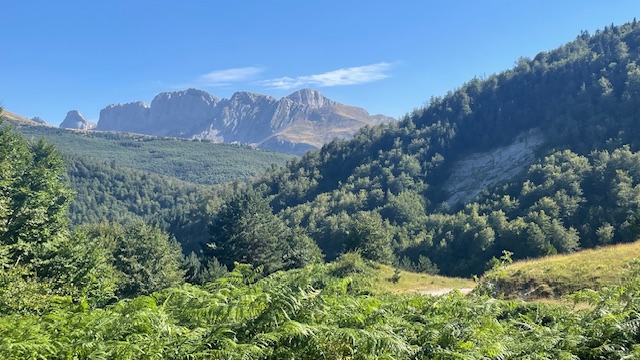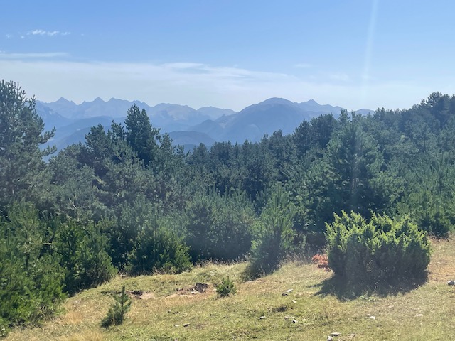 Am Lakuaga (1.415 m) warnen uns dann eine Hoede Hütehunde ganz besonders energisch, dass wir der auf der anderen Seite des Berges lagernden Herde nicht einen Schritt zu nah kommen sollten. Der Losung im am Wegesrand knapp unterhalb des Gipfels nach, handelt es sich um Schafe. Der Weg führt auf einem Pfad über steppenartige Flächen mit vereinzeltem Baumbesatz und einer fantastischen Sicht auf den Hauptgebirgszug der Pyrenäen im Norden und den Pyrenäenausläufern im Süden. In den Wiesen, die wir durchqueren, und in den Grünstreifen entlang der Wege scheuchen wir im eine unzählbare Zahl von Schmetterlingen in allen Farben, Formen und Formen auf.