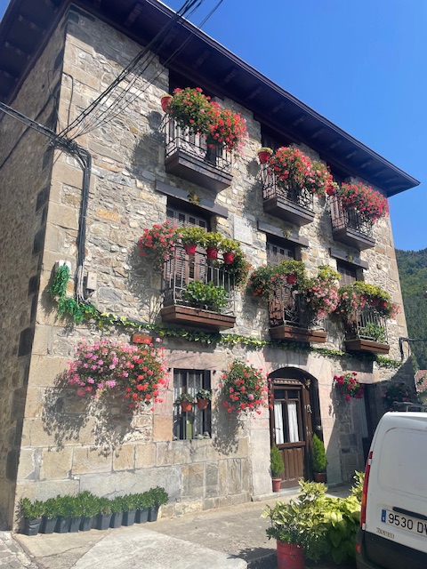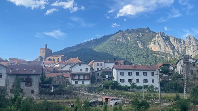 In dem 410-Einwohner-Ort genießen wir die Pause bei kühlen Getränken und füllen unsrer Vorräte für den kommenden Tag auf, während die Kinder eine Stunde im örtlichen öffentlichen Schwimmbad verbringen können. Unsern Einkauf verbinden wir mit etwas Sightseeing. Unser Weg führt uns durch das Dorf über schmale gepflasterte Gassen mit Geranien geschmückten Holzbalkonen an Steinhäuser traditioneller baskischer Bauweise, vorbei an dem schwer übersehbaren Kitchturm von San Cipriano, die eine barocke Orgel von 1751 und einen Altar im plateresken Stil, einem Architekturstil der Frührenaissance in Spanien aus dem Ende des 15. Jahrhunderts, verfügt.