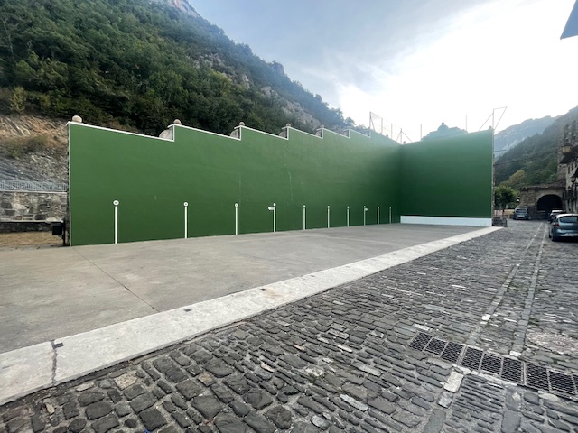 Nach jetzt zur Routine werdenden 6-Uhr-Aufstehen und einem Frühstück zwischen fertig gepackten Rucksäcken in Cafe, 20 Meter die Straße von der Unterkunft herunter, verabschieden wir uns bei unserer sehr freundlichen Vermieterin und machen uns auf die heutige Etappe. Diese führt uns zunächst durch den Urzainqui. Uns fallen die schön mit Blumen geschmückten Haus auf und ein Sportplatz, der mir schon beim Durchzappen auf dem Fernseher in Pamplona aufgefallen war: Zwei Teams mit je zwei Spielern schlagen einen Tennisball-großen Ball an Wände, die an einen überdimensionalen, zur rechten Seite offenen Squash-Court erinnern mit bloßen Händen, als ob sie Squash-Schläger in der Hand hätten. Ich muss später heraus finden, wie dieser Sport heißt.