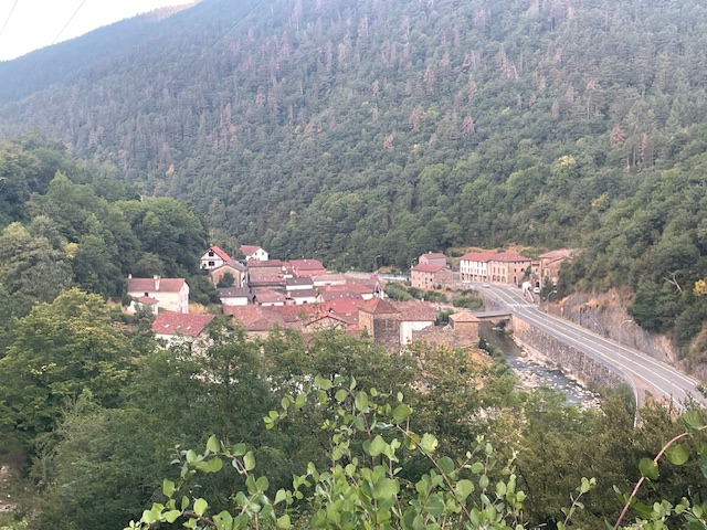 , nachdem wir noch mit einem anderen GR11-Reisenden ins Gespräch kommen, den wir bereits aus der Bäckerei in Ochagavia/Otsagabia vom Sehen kennen. Die Kinder beschäftigen sich derweil mit dessen Hund. Wir verlassen den GR11 und wählen die schnellste Route durch das Esca-Tal, die uns entlang der Bundesstraße nach Urzainqui führt.