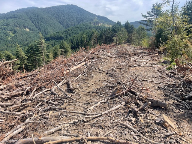 Der nun folgende Etappenabschnitt wäre ohne unseren Garmin mit seiner genauen GPS-Ortung und vorher einprogrammierter Streckenführumg nicht möglich gewesen, da ganze Teilabschnitte vollständig ohne Markierung sind und jegliche Beschilderung fehlt. Zunächst müssen wir der für Baufällarbeiten bzw. mit den dafür bestimmten schweren Kettenfahrteugen vollständig verunstalteten Straße in herunterbrennender Sonne steil den Berg hinauf folgen. Die Freude, diese wieder verlassen zu können und über einem einfachen Waldpfad relativ eben gut und schnell vorau zu kommen, währt nicht lange, da wir die gerade stattfinde, komplette Abholzung dieser Bergkuppe und damit die Zerstörung dieses wunderschönen Stückchens Natur hautnah erleben müssen. Für uns ein schauriger Anblick vor dem feien nun Blick auf das Ezcaurre-Massiv mit seinen fünf Gipfeln, darunter der Peña Ezcaurre als höchster mit 2.045 m. Dem Gesichtsausdruck des Waldarbeiters nach auch ein ungewöhnlicher Ort für Besucher. Zum Glück können wir den Tatort der Baumfällarbeiten großräumig umgehen und gehen weiter steil im brennender Sonne den Berg hinauf. Als wir dann auch endlich den richtigen weiterführenden Wanderweg im steilen, mit Pflanzen zugewachsen Gelände finden und diesem folgen, können wir die ersten Markierungen unseres Wanderweges an den Bäumen dieses intakten, vollständig mit Farne bedeckten Waldes sehen und sind erleichtert, offensichtlich den richtigen Weg gefunden zu haben. Wie sind froh, den Bereich der Baumfällarbeiten verlassen zu haben. Eine Pause im Schatten nach dem schweren Aufstieg tut der erschöpften Stimmung in der Gruppe sehr gut.