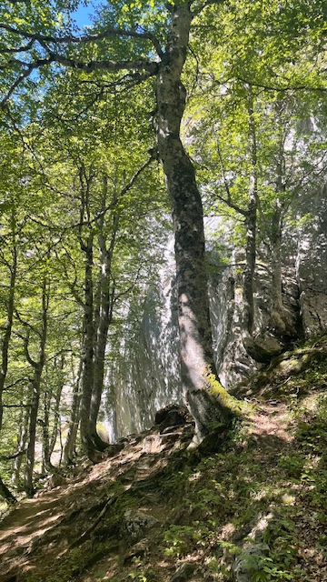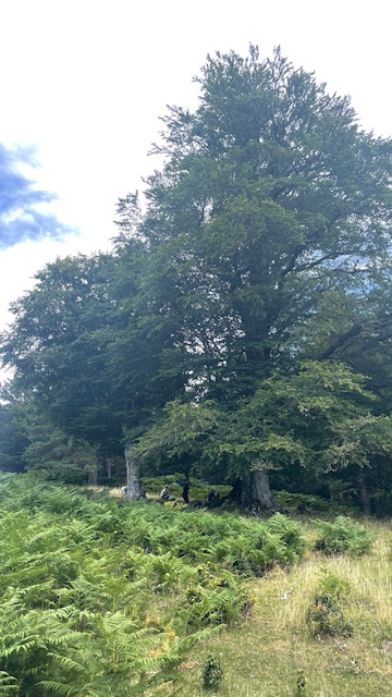 Die dann folgenden Streckenabschnitte waren alle bisherige Mühe wert: Schattige und waldbesetzte Flächen, große offene Wiesen mit riesigen Inseln aus Farne und wunderschöne (ur-)alte Baumbestände, die einzeln und in kleinen Gruppen zusammenstehen, lösen dich abwechselnd ab und lassen den Blick auf den Flächen vor dem Bergpanorama der Pyrenäen streifen. Nur die Losungen der Schafe und/oder Ziegen und einiger Pferde lassen uns wissen, dass diese Flächen auch durch den Menschen genutzt werden. Wir sind dort zum Glück mutterseelenallein und beginnen die Pyrenäen das erste Mal richtig zu erleben.