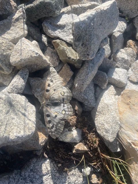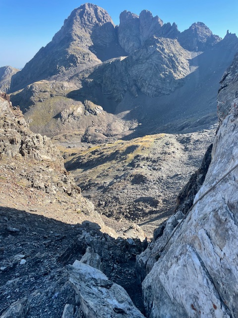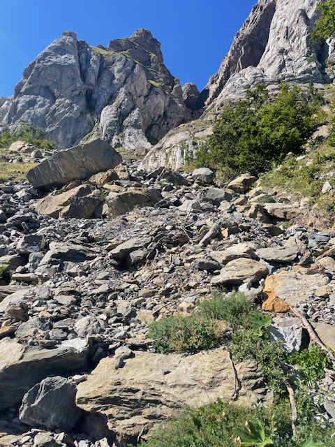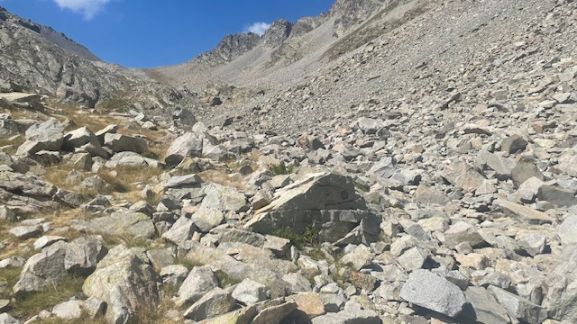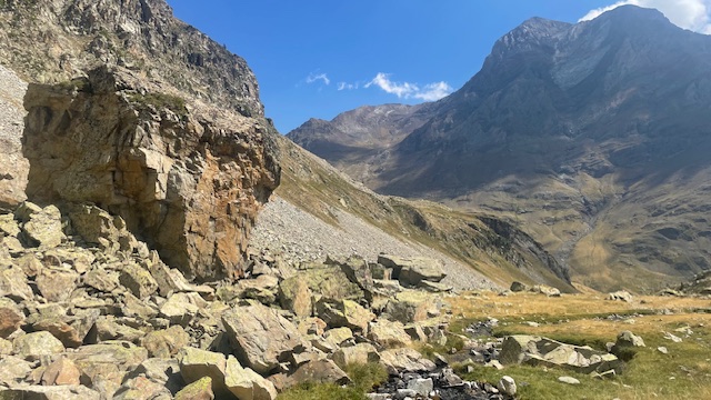 Die ersten Gruppen verlassen mit Tagesgepäck die Refugio de Linza (1.344 m). Wie brechen nach der Übernahme der Lunchpakete und dem Auffüllen der Wasserflaschen ebenfals auf. Es geht auf die Route der Senda de Gamueta zunächst kurz nach Süden und anschließend immer Richtung Osten, die uns zunächst zu dem gegenüber der Hütte sichtbaren Paso del Caballo (1.440) führt. Das Wettrennen um Schatten gegen die Sonne im Parque National de Los Valles Occidentales hat begonnen, da die Schatten-Sonne-Grenze aus unserer Sicht hoffnungslos schneller das weite Tal und folgend hinaufkommt als wir aufsteigen können. Der von Osten, uns ins Gedicht wehende Wind ist umso mehr ein willkommener Begleitet. Die grün-gelbe Wegmarkierung wird und heute auch verfolgend. Die Baumgrenze haben wir bereits bei ca. 1.500 m erreicht. Wie gehen über eine an ausgetrockneten (Schmelzwasser-)Bachläufe gelegen trockenen Wiesen-/Steppenlandschaft, die scheinbar noch genug Nährwert für Kühe habt, um sie hier unter konstant läutenden Kuhglockengeläut grasen zu lassen. Die Refugio de Plana de Diego (1.625 m) zu unserer Rechten auf dem Hügel ist, zumindest im derzeitigen Zustand sicher keine Schutzhütte für Wanderer. Das Gelände wird mit jedem geschafften Höhenmeter hochalpiner. Auf Höhe des Mallo Gorreta (2.266 m), den wir zu unser Linken sehen, überholen wir eine sehr freundliche Gruppe französischer Wanderer, mit denen wir bereits bei unserer Pause etwas länger gesprochen hatten. Es wird nicht die letzte Begegnung am heutigen Tag bleiben. Nachdem wir den Mallo Poco Gamueta (1.994 m) und den Mallo Gorreta (2.266 m) zu unserem Seiten passieren führt der Wanderweg über das Geröllfeld hinauf zur Steinwüste unterhalb des Anzotiello (2.211 m). Wir sind froh, dass wir nach dem losen Geröll wieder festen Gripp mit den Wanderschuhen haben, und steigen bis zum Passo de Anzotiello (2.017 m) auf, der uns eine fantastischen Blick auf die östlichen Ausläufer des Nationalparks mit dem Tal Las Toscas und seine imposanten Gipfeln zu beiden Seiten direkt vor uns und dem Parque National des Pyrenees am Horizont präsentiert. Der Wind weht und start, aber angenehm ins Gesicht.