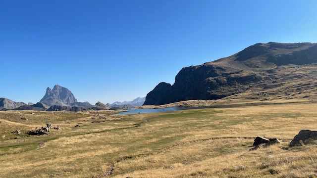 Mit dem Erreichen der Hütte haben wir Navarra verlassen und befinden uns jetzt in der autonomen Gemeinschaft Aragon bzw. der Provinz Huesca. Nördlich von uns bildet der Mesa de los Tres Reyes (2.428 Meter) als höchster Berg Navarras auch die Grenze zu Frankreich. Wir befinden uns am westlich Rand des Larra-Belagua-Massivs, etymologgisch nach baskischer Toponymie das Moor (= Laror) und ein Weideplatz für Hirten. Der höchste Gipfel ist der des Pic d‘Anie (2.504 m).