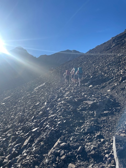 6:00 Uhr stehen wir auf. Frühstück gibt es ab 6:30 Uhr: Wir sind nicht die einzigen Frühstarter in den Tag: Wie in einem Bienenstock schwirren die Menschen zwischen Schlafplatz, Bad, Frühstück, Schuhraun und Wasserauffüllstation scheinbar wild umher.